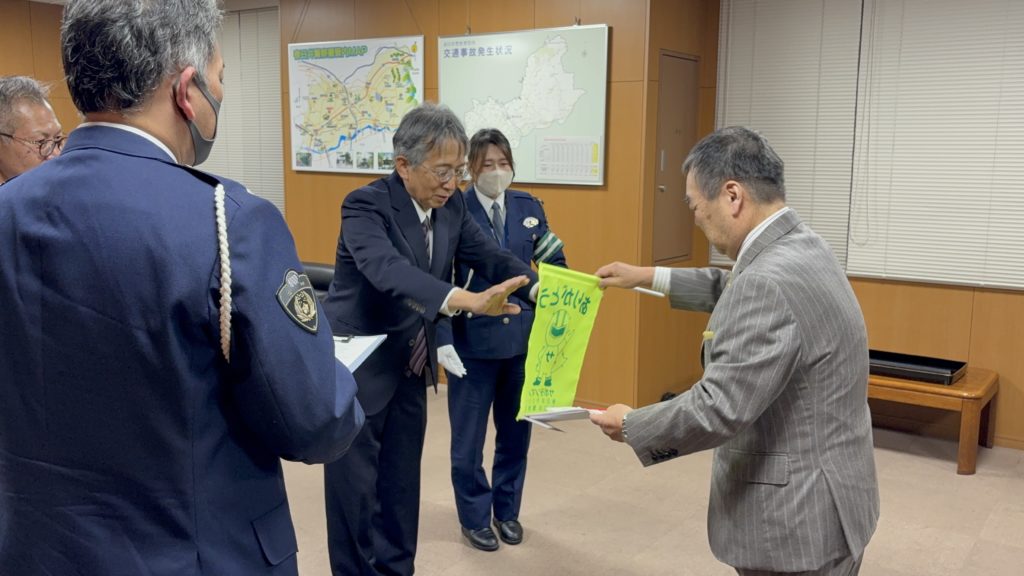 警察署長、交通課長、交通安全協会会長へお渡しいたしました。